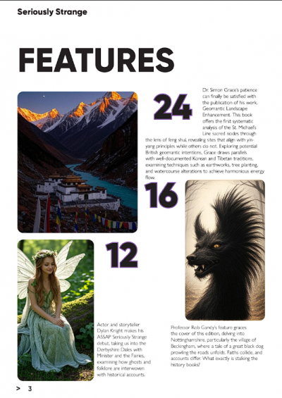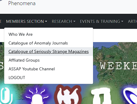 | Seriously Strange Magazine | Print + digital PDF | Endevouring for multiple issues per year | Exclusive features, creative pieces, research articles; member submissions welcome. |